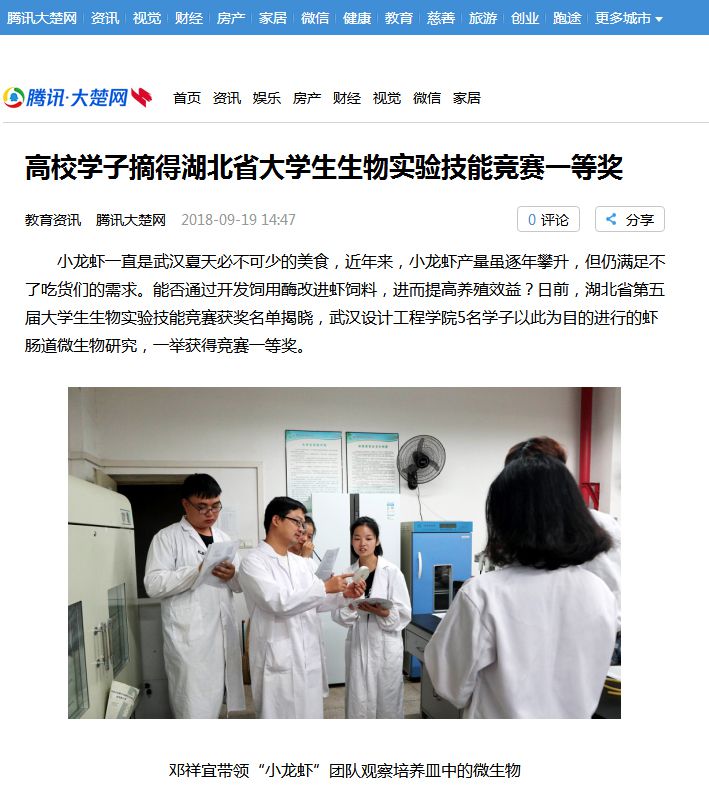 小龙虾一直是武汉夏天必不可少的美食,近年来,小龙虾产量虽逐年攀升,但仍满足不了吃货们的需求。能否通过开发饲用酶改进虾饲料,进而提高养殖效益?日前,湖北省第五届大学生生物实验技能竞赛获奖名单揭晓,威廉体育williamhill5名学子以此为目的进行的虾肠道微生物研究,一举获得竞赛一等奖。
