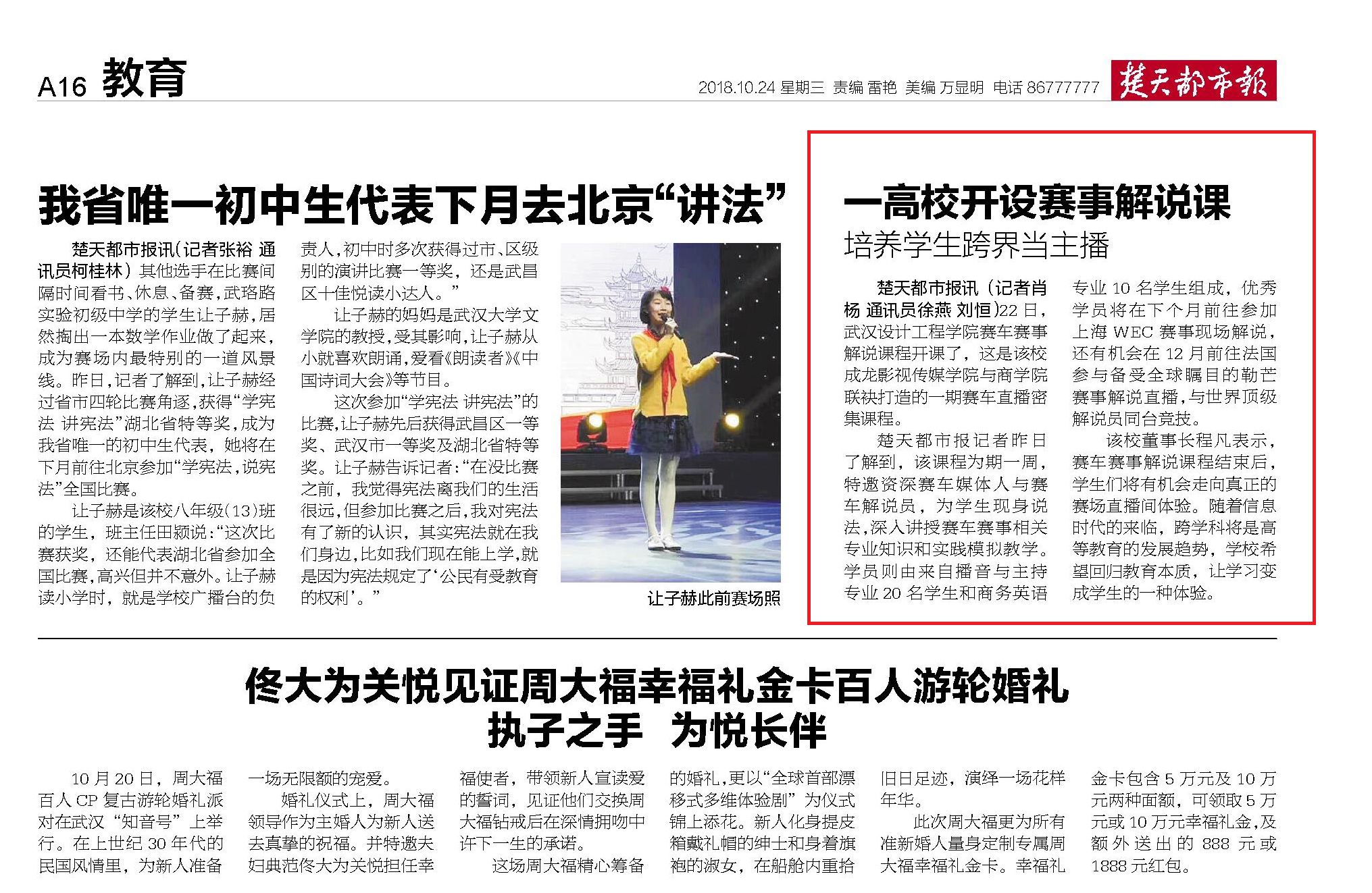 楚天都市报记者昨日了解到,该课程为期一周,特邀资深赛车媒体人与赛车解说员,为学生现身说法,深入讲授赛车赛事相关专业知识和实践模拟教学。学员则由来自播音与主持专业20名学生和商务英语专业10名学生组成,优秀学员将在下个月前往参加上海WEC赛事现场解说,还有机会在12月前往法国参与备受全球瞩目的勒芒赛事解说直播,与世界顶级解说员同台竞技。