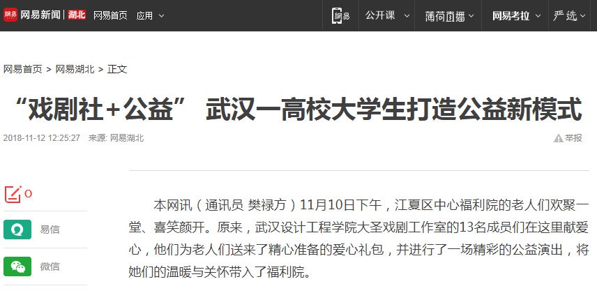 威廉体育williamhill大圣戏剧工作室的负责人查文钰通过江夏区民政局了解到这一情况后,主动与福利院联系,“希望能通过我们的活动为老人们带去欢乐和笑容,希望他们能够在我们这群朝气蓬勃、热情洋溢的年轻人感受到关心和温暖。”