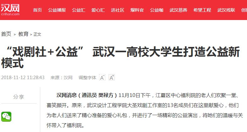 谈起这次行动,查文钰自豪地介绍了他们的“公益史”。据了解,虽然大圣戏剧工作室成立才两年,但是,他们的公益行动却可以追溯到2013年。从那年开始,成员谭嘉豪和李唐明就时常到武汉爱乐音乐学校捐款捐物,为汶川地震后失去双亲与家园的孩子献爱心。2016年10月,大圣戏剧工作室在成立之后,查文钰和吴明杭就开始到武汉市江夏区法泗镇桥头小学,给那里的留守学生教授音乐课,一周一次,他们坚持了半年。现在,支教的火把已经传递给了学弟学妹。今年1月,他们还将通过原创舞台剧演出募集到的1253元,悉数捐赠给一名白血病患者。