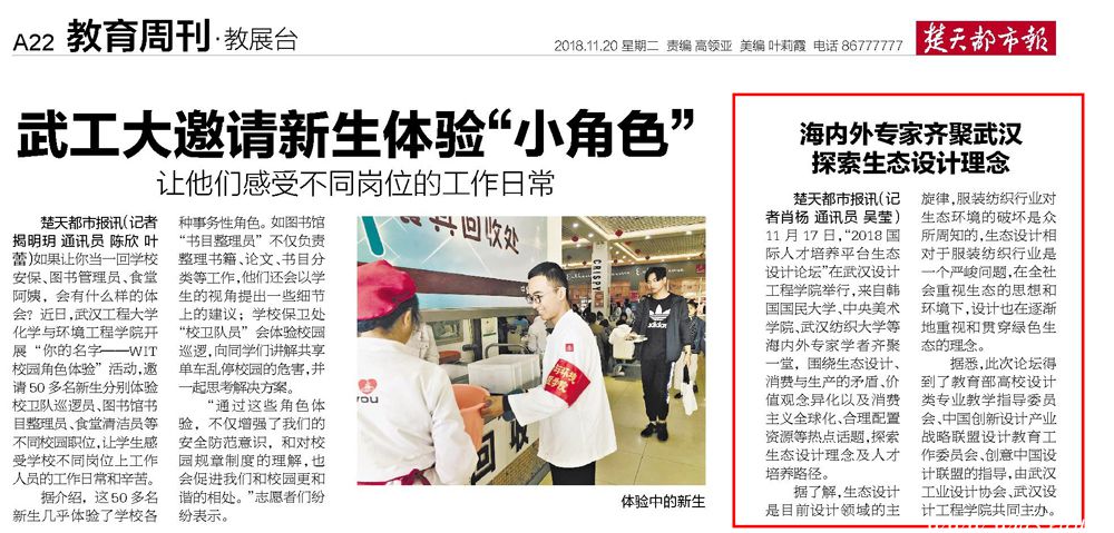 楚天都市报讯(记者肖杨通讯员吴莹)11月17日,“2018国际人才培养平台生态设计论坛”在威廉体育williamhill举行,来自韩国国民大学、中央美术学院、武汉纺织大学等海内外专家学者齐聚一堂,围绕生态设计、消费与生产的矛盾、价值观念异化以及消费主义全球化、合理配置资源等热点话题,探索生态设计理念及人才培养路径。