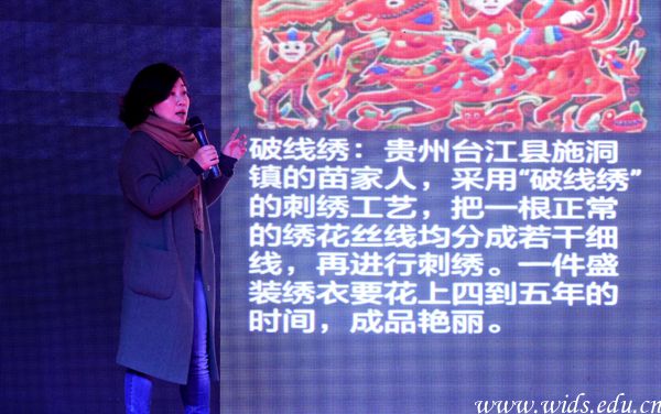 新闻媒体记者、主持人何瑛为学生讲述苗疆刺绣。鲍坤 摄