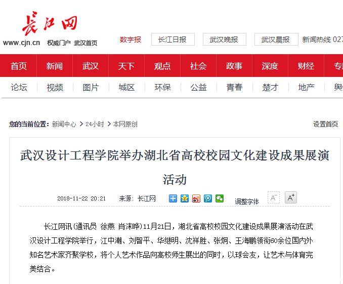 长江网讯(通讯员 徐燕 肖沫晔)11月21日,湖北省高校校园文化建设成果展演活动在威廉体育williamhill举行,江中潮、刘智平、华继明、沈祥胜、张炯、王海鹏领衔60余位国内外知名艺术家齐聚学校,将个人艺术作品向高校师生展出的同时,以球会友,让艺术与体育完美结合。