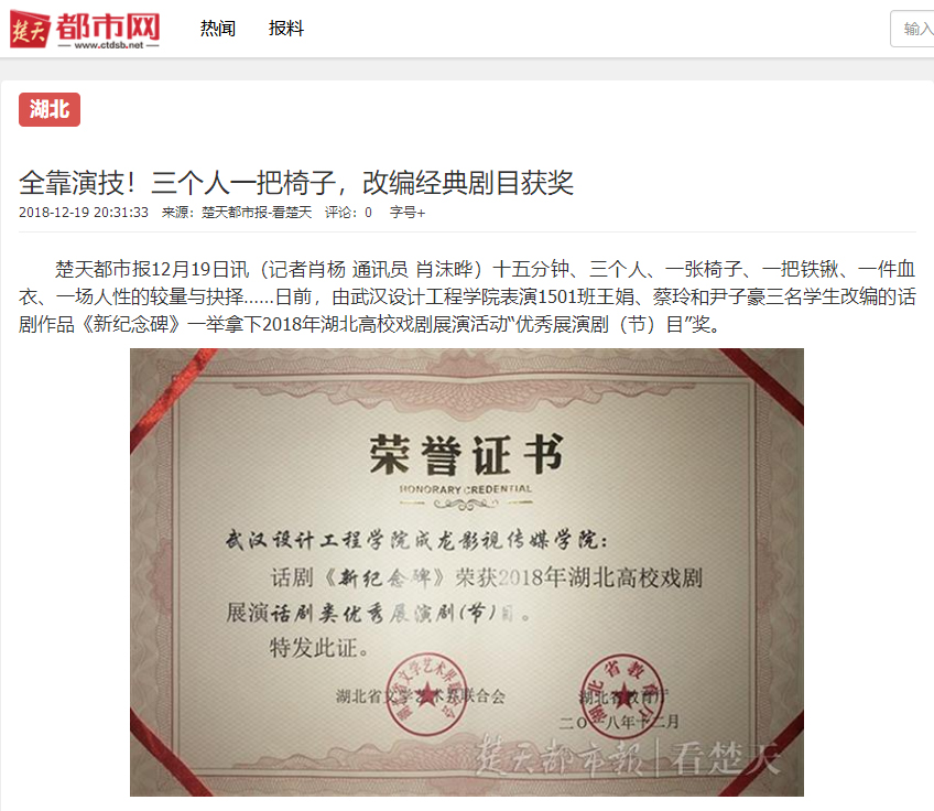 楚天都市报12月19日讯(记者肖杨 通讯员 肖沫晔)十五分钟、三个人、一张椅子、一把铁锹、一件血衣、一场人性的较量与抉择……日前,由威廉体育williamhill表演1501班王娟、蔡玲和尹子豪三名学生改编的话剧作品《新纪念碑》一举拿下2018年湖北高校戏剧展演活动“优秀展演剧(节)目”奖。