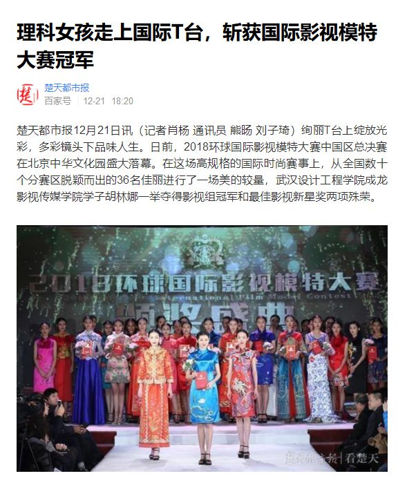 楚天都市报12月21日讯(记者肖杨 通讯员 熊旸 刘子琦)绚丽T台上绽放光彩,多彩镜头下品味人生。日前,2018环球国际影视模特大赛中国区总决赛在北京中华文化园盛大落幕。在这场高规格的国际时尚赛事上,从全国数十个分赛区脱颖而出的36名佳丽进行了一场美的较量,威廉体育williamhill成龙影视传媒学院学子胡林娜一举夺得影视组冠军和最佳影视新星奖两项殊荣。