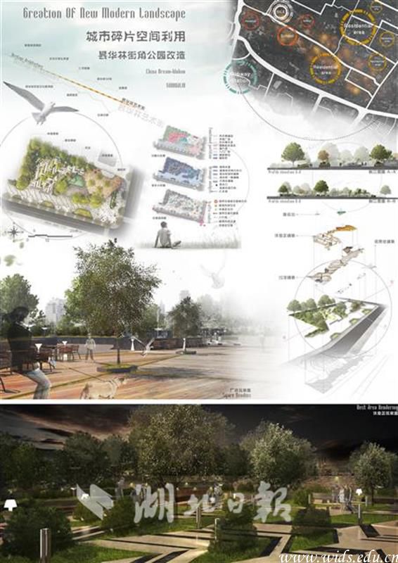 肖佳宇今年大三,此次的作品《新现代化景观绿化设计——城市碎片空间利用》以昙华林街角公园的改造为内容,从激烈的竞争中脱颖而出,获得了“设计表现周”计算机表现类一等奖。“可能是我软件技术还不错吧。”肖佳宇挠挠头。记者了解到,为了将作品设计好,他自己去昙华林考察多次,展示出来的作品不仅包括景观设计,还涉及到地形、排水、照明、交通引流线、功能分区等多个方面,考虑得十分周到。