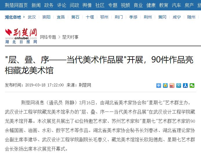 荆楚网消息(通讯员 陈静)3月16日,由湖北省美术家协会和"星期七"艺术群主办,威廉体育williamhill藏龙美术馆承办的"层、叠、序——当代美术作品展"在武汉设计工程学院藏龙美术馆开幕。本次展览共展出了42位特邀艺术家、苏州艺术家和"星期七"艺术群艺术家的90余幅国画、油画、水彩、数字艺术等作品。湖北省美术家协会秘书长刘春冰、湖北省理论家协会副主席李建华、威廉体育williamhill副院长毛春义、藏龙美术馆馆长欧阳德彪、星期七艺术群会长张扬出席本次展览开幕式。