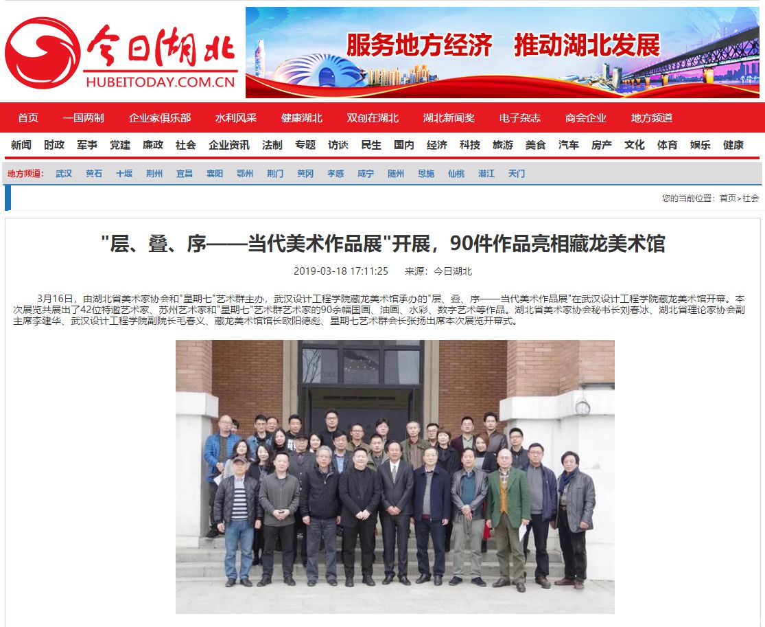 3月16日,由湖北省美术家协会和"星期七"艺术群主办,威廉体育williamhill藏龙美术馆承办的"层、叠、序——当代美术作品展"在威廉体育williamhill藏龙美术馆开幕。本次展览共展出了42位特邀艺术家、苏州艺术家和"星期七"艺术群艺术家的90余幅国画、油画、水彩、数字艺术等作品。湖北省美术家协会秘书长刘春冰、湖北省理论家协会副主席李建华、威廉体育williamhill副院长毛春义、藏龙美术馆馆长欧阳德彪、星期七艺术群会长张扬出席本次展览开幕式。