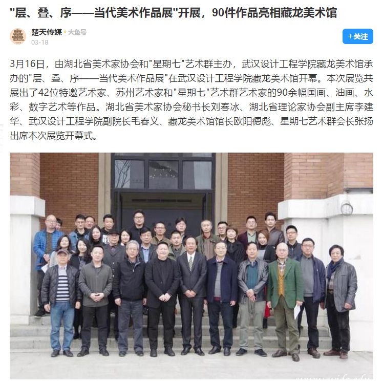 3月16日,由湖北省美术家协会和"星期七"艺术群主办,威廉体育williamhill藏龙美术馆承办的"层、叠、序——当代美术作品展"在威廉体育williamhill藏龙美术馆开幕。本次展览共展出了42位特邀艺术家、苏州艺术家和"星期七"艺术群艺术家的90余幅国画、油画、水彩、数字艺术等作品。湖北省美术家协会秘书长刘春冰、湖北省理论家协会副主席李建华、威廉体育williamhill副院长毛春义、藏龙美术馆馆长欧阳德彪、星期七艺术群会长张扬出席本次展览开幕式。