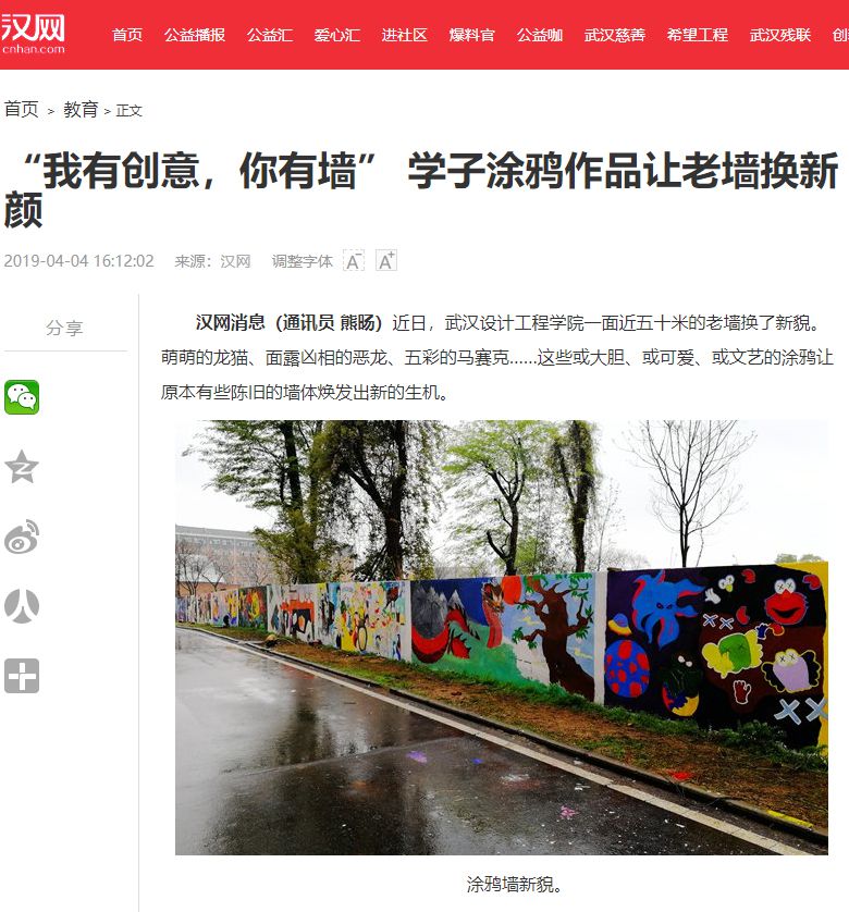 汉网消息(通讯员 熊旸)近日,威廉体育williamhill一面近五十米的老墙换了新貌。萌萌的龙猫、面露凶相的恶龙、五彩的马赛克……这些或大胆、或可爱、或文艺的涂鸦让原本有些陈旧的墙体焕发出新的生机。