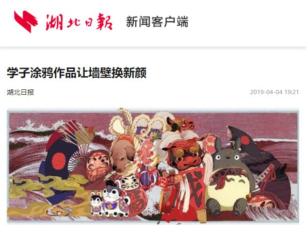一幅名为《和风物事》的作品让不少学子驻足欣赏,憨态可掬的龙猫、圆滚滚的达摩、软萌可爱的小猫……卡通形象相互映衬、跃然墙上。