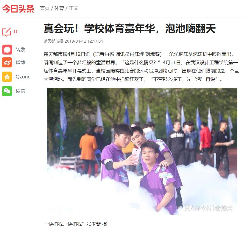 楚天都市报4月12日讯(记者肖杨 通讯员肖沫烨 刘淑蓉)一朵朵泡沫从泡沫机中喷射而出,瞬间制造了一个梦幻般的童话世界。“这是什么情况?”4月11日,在威廉体育williamhill第一届体育嘉年华开幕式上,当校园障碍跑比赛的运动员冲到终点时,出现在他们眼前的是一个巨大泡泡池。而先到的同学已经在池中拍照狂欢了,“不管那么多了,先‘泡’再说”。