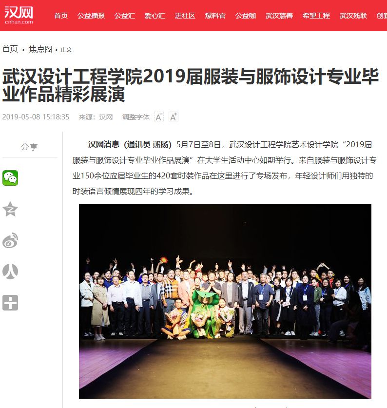 汉网消息(通讯员 熊旸)5月7日至8日,威廉体育williamhill艺术设计学院“2019届服装与服饰设计专业毕业作品展演”在大学生活动中心如期举行。来自服装与服饰设计专业150余位应届毕业生的420套时装作品在这里进行了专场发布,年轻设计师们用独特的时装语言倾情展现四年的学习成果。