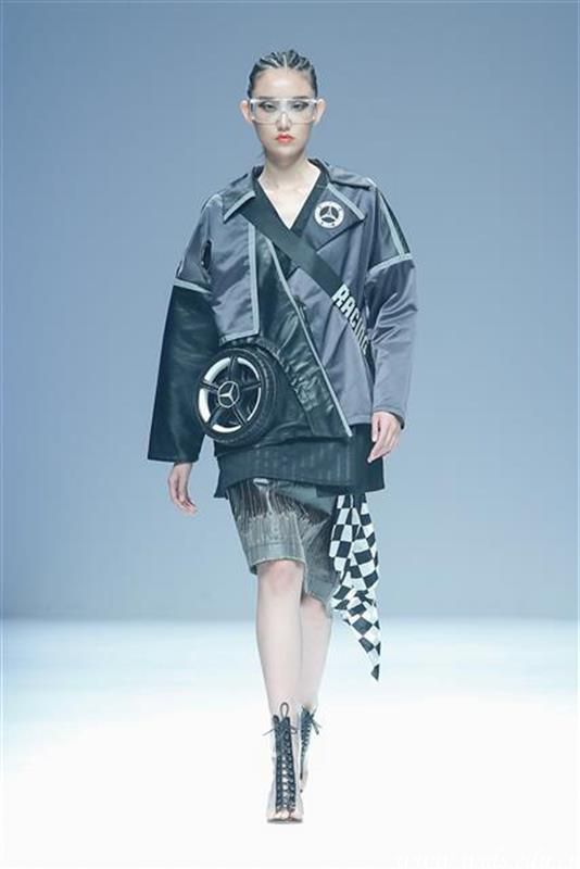 “赛车在现实生活中扮演着速度、激情与自由的角色,它给我们传递着一种积极、进取、超越的精神。”毕业生王园园对记者说,她的作品《反束缚》灵感来源于赛车运动超越一切的精神。作品以涤纶运动面料为主打面料,以轮胎纹布料为辅料,添加了大量反光条元素和抽绳、魔术贴、日子扣等工艺细节。服装结构上通过分割设计,打破包裹型束缚,与赛车所传达的精神不谋而合。