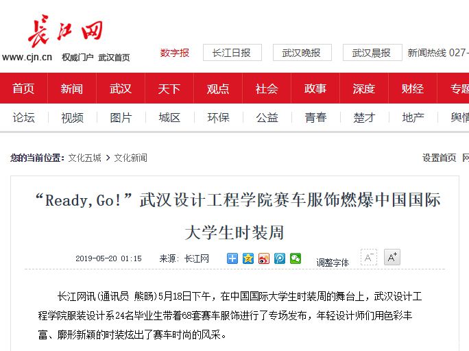 长江网讯(通讯员 熊旸)5月18日下午,在中国国际大学生时装周的舞台上,威廉体育williamhill服装设计系24名毕业生带着68套赛车服饰进行了专场发布,年轻设计师们用色彩丰富、廓形新颖的时装炫出了赛车时尚的风采。