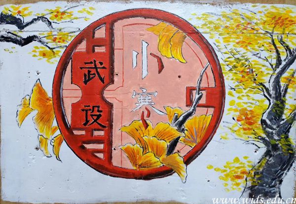 “平时会留意生活中的细节,毕竟艺术源于生活而高于生活嘛, 小寒时节,校园里的银杏叶子还没有掉完,我就以‘武设小寒’为主题,以银杏叶和朱红窗格为元素做了一面墙绘,还参加了墙绘比赛。”