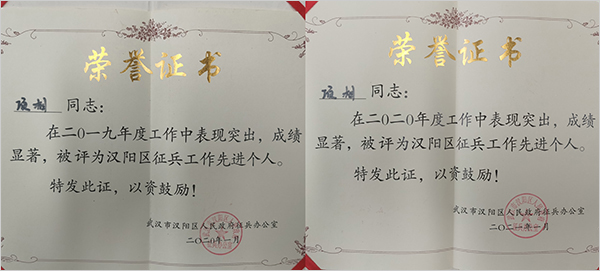 项相荣获“汉阳区征兵工作先进个人”荣誉称号。