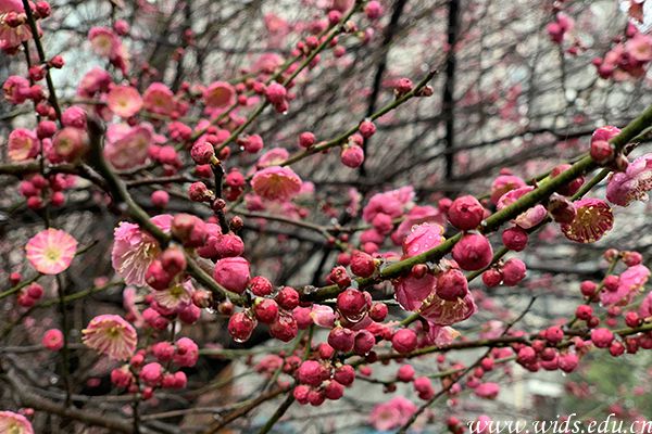 红梅盛开,用鲜红的花瓣笑弄迎春的到来。