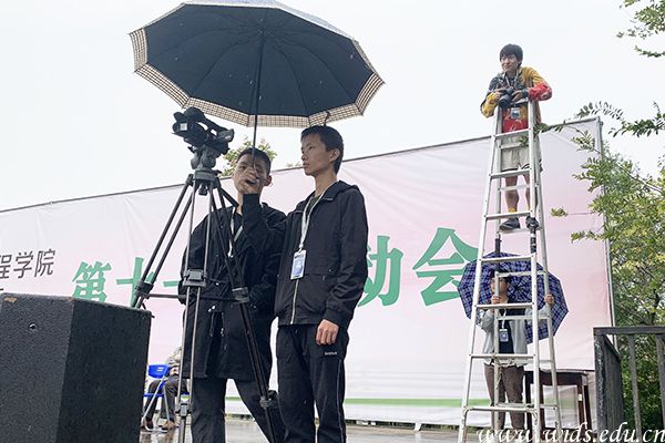 早上七点,天空中下起了淅淅沥沥的小雨,大学生通讯社的同学们早早地就来到了足球场,搬桌子、拿椅子、搭帐篷,为通讯社一天的工作“安营扎寨”。除了要收集、整理、审核、筛选各学院送来的加油稿之外,他们还要还负责运动会当天的摄影、摄像、采访、直播等工作。大学生通讯社副社长彭雅琦在接受记者采访时讲到:“今天的天气确实比较冷,但是面对自己的任务,通讯社的记者们一刻也没有松懈。为了更好的拍的摄效果,摄影部同学们站在三米多高的梯子上冒雨拍摄,宣策部和新媒体部的同学们也一直奔走在运动场上,记录运动员们的精彩瞬间,为同学们直播赛况。”