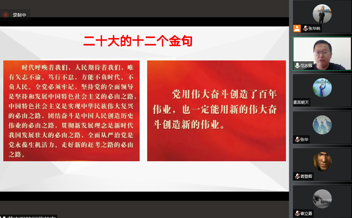 10月25日下午,物电学院物理党支部以线上方式组织学习党的二十大报告。学院党委委员、纪委书记、副院长范志强同志代表上级党组织给本支部全体党员上党课,作了题为《数读二十大报告》的报告。主要介绍了党的二十大报告中的十二个金句,并用二十个数字概括了党所取得的巨大成就。党支部书记张华林同志介绍了党的二十大报告中的新观点、新论断、新思想。之后全体党员分别谈了学习党的二十大报告的体会,并进行了认真的讨论。(图、文/张华林 审/张国强)