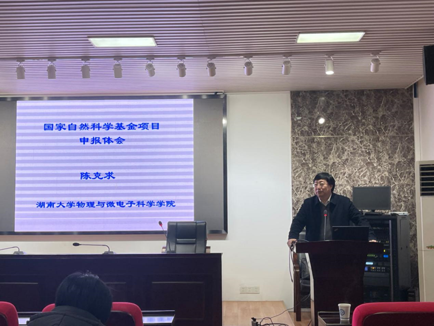 3月5日下午在理科楼B413会议室,湖南大学陈克求教授莅临我院作了题为《国家自然科学基金申报体会》的讲座。学院国自科基金申报人进40余人参加讲座,刘斯副院长主持会议。