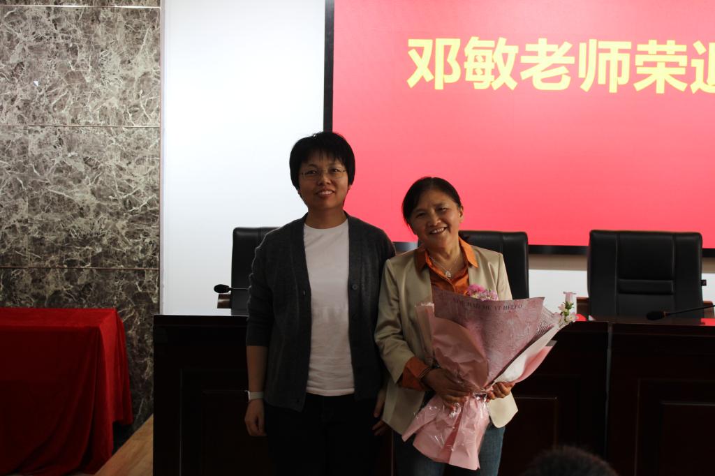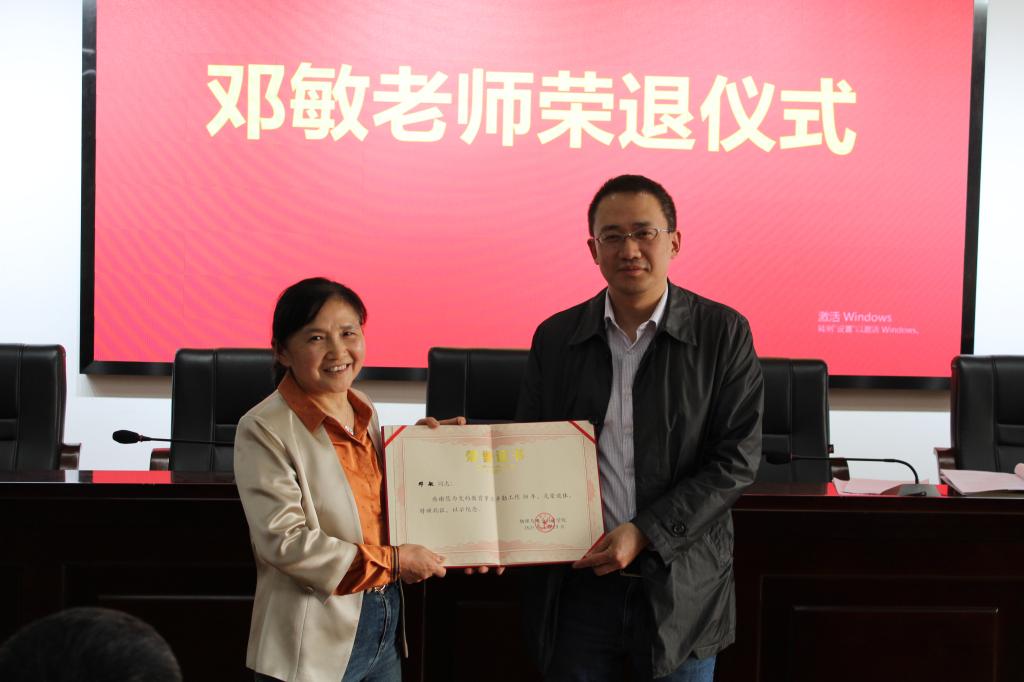 恰逢邓敏老师光荣退休,学院工会为她举办了一场隆重的荣退仪式。常务副院长邓科为邓敏老师颁发了荣退证书,他对邓老师为学院人才培养,实验教学工作等作出的贡献表示钦佩,祝福邓老师退休生活丰富多彩。学院副院长刘斯代表学院全体教师向邓敏老师献上鲜花和贺卡。