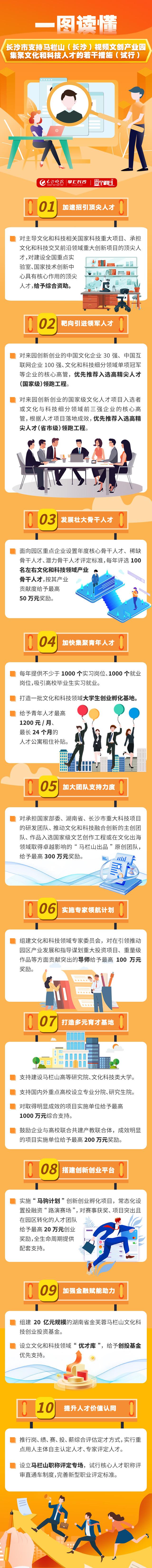 现场,长沙市支持马栏山(长沙)视频文创产业园集聚文化和科技人才的若干措施发布,从加速招引顶尖人才、靶向引进领军人才、发展壮大骨干人才、加快集聚青年人才、加大团队支持力度、实施专家领航计划、打造多元育才基地、搭建创新创业平台、加强金融赋能助力、提升人才价值认同等10个方面全方位推进文化和科技人才集聚。