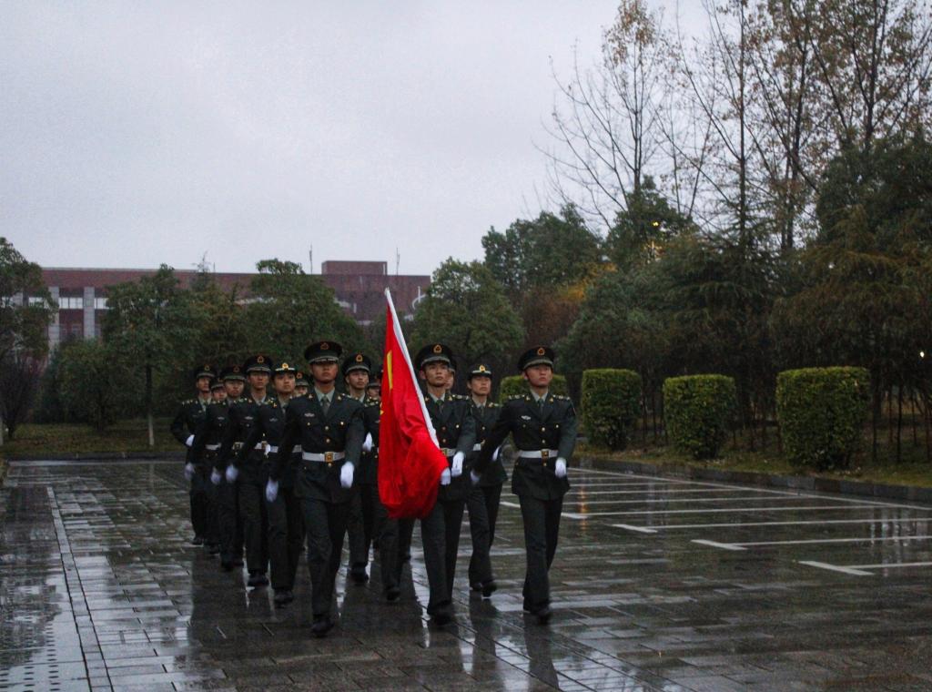 清晨6:30分,云影湖畔,天色朦胧,细雨飘零。全体同学整齐划一的在图书馆门口集合。在全体师生的注目礼下,英姿飒爽的国旗护卫队队员们护送鲜艳的五星红旗进场,礼行完毕,伴随着庄严的《中华人民共和国国歌》,五星红旗冉冉升起,迎风飘扬。在场的每一个人向国旗行注目礼,深怀对祖国的无限热爱和崇高敬意。