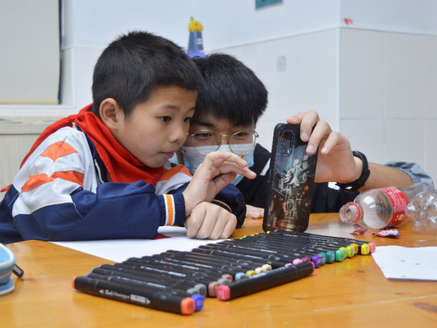 志愿者杨亚鑫同学由神舟十三的顺利发射引入课题,先向同学们介绍了什么是水火箭以及如何制作水火箭,再强调了发射水火箭的注意事项以防在操作时发生意外,最后向同学们科普了水火箭的基本原理。志愿者还鼓励孩子们用画笔装饰水火箭,描绘出自己心中的航天梦。