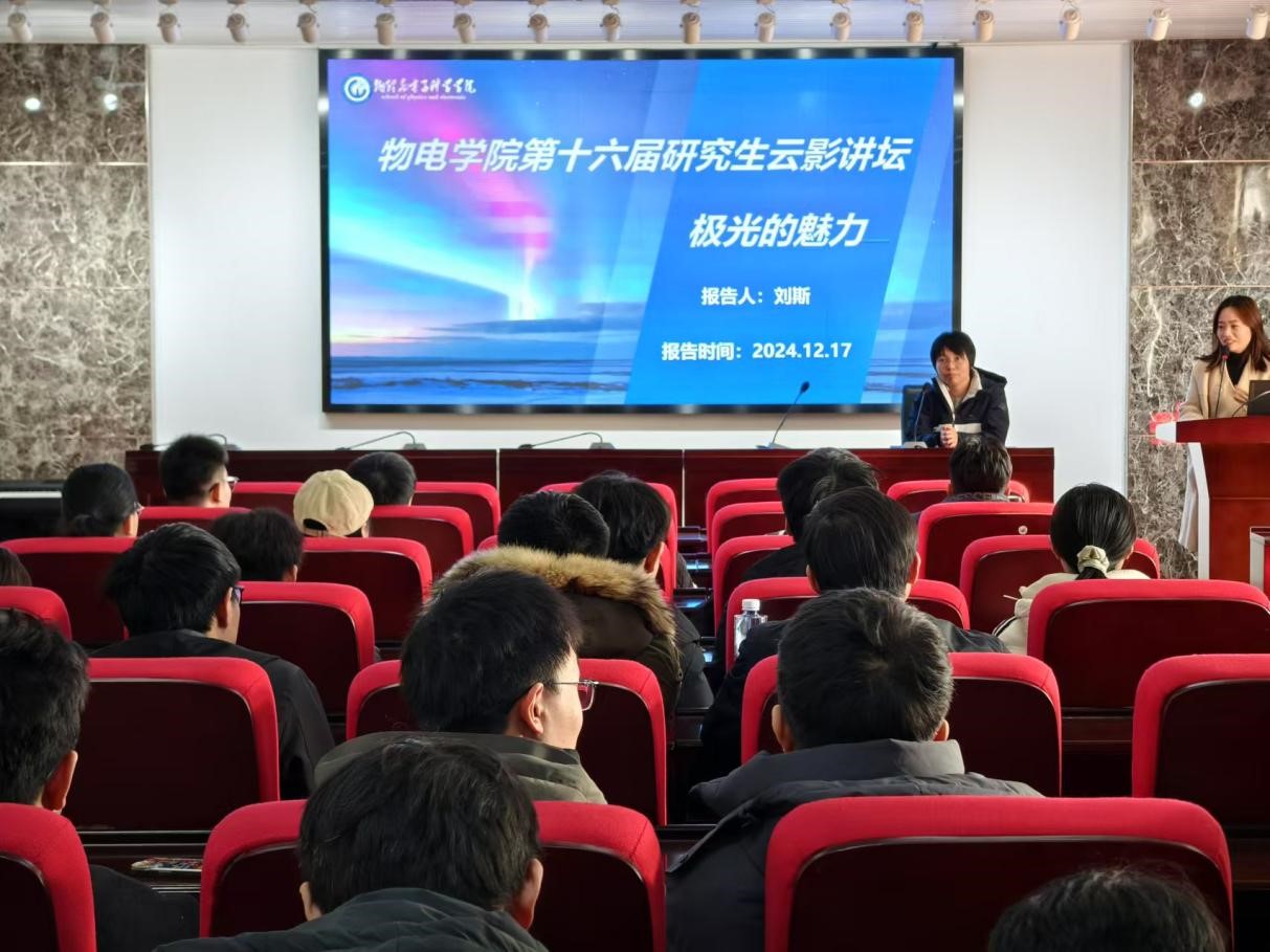 12月17日下午,威廉体育williamhill第十六届研究生云影讲坛物电学院分论坛在理科楼B413举行。本次讲座邀请到国家级人才计划青年学者、湖湘青年英才刘斯教授主讲,她以《极光的魅力》为题,为同学们带来了一场精彩的报告。报告由研究生辅导员蒋琳嫒老师主持。