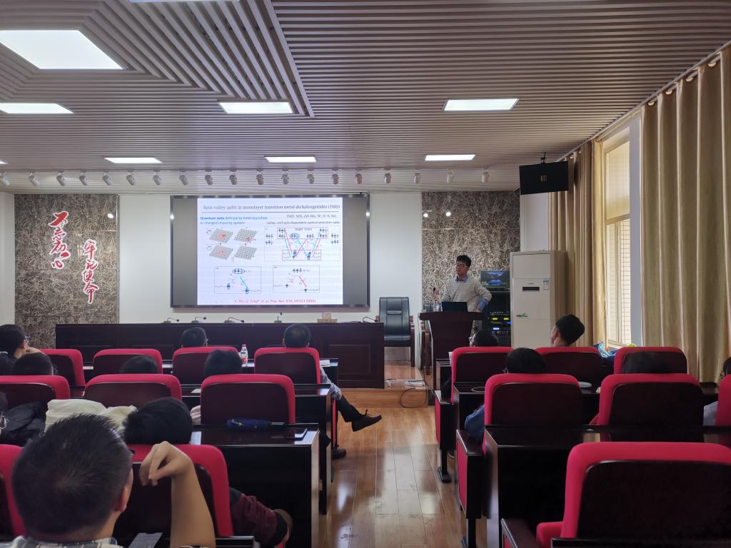 张院长首先向大家简单介绍了童教授。童庆军教授主要从事于凝聚态物理以及量子光学方向的研究。目前的研究兴趣包括:二维材料和范德瓦尔斯异质结中的自旋能谷现象,平衡以及非平衡量子系统中的拓扑性质,开放系统中的退相干及其抑制。童教授迄今在Nature physics, Science advances, Nano letters,Phys.Rev.lett., Phys.Rev.A/B等期刊发表了多篇学术论文。