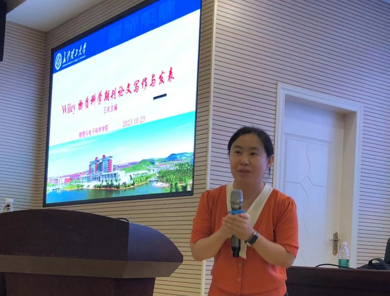 2023年10月23日下午,Wiley主编王欢来我院作了《Wiley物质科学期刊论文写作与发表》的学术讲座。讲座在理科楼A200会议室进行,学院部分本科生、研究生和教师参加,张卫兵副院长(主持工作)主持讲座。