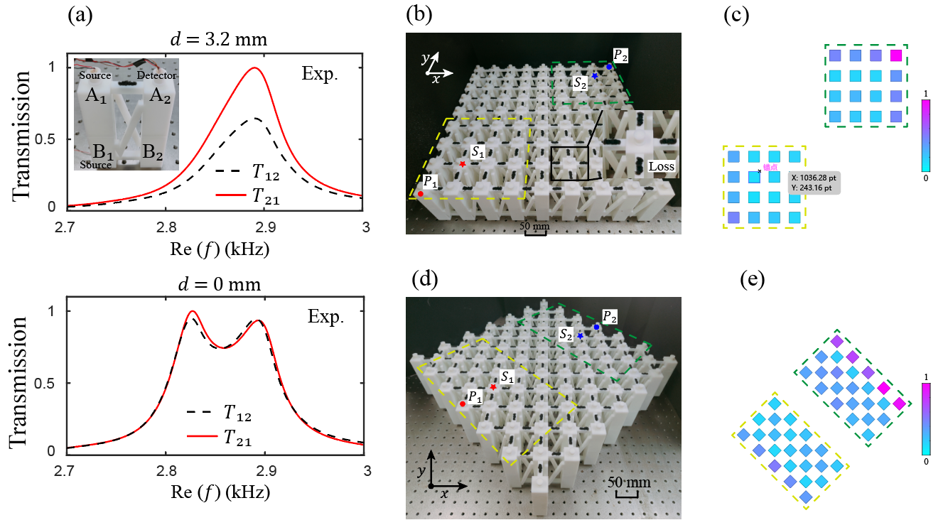 图1. (a)损耗诱导的非互易传输观测。(b)正方形声子晶体样品。(c)正方形声子晶体中的角趋肤观测。(d)菱形声子晶体样品。(e)菱形声子晶体中的边界趋肤观测。