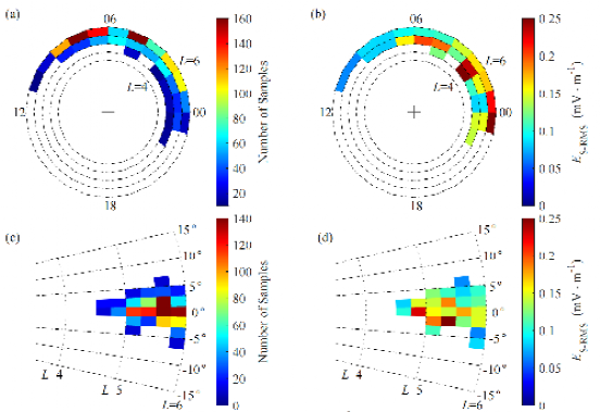 图1 在L-MLT (a,b)和L-MLAT (c,d)坐标系中,(a,c)合声波-ECH波非线性相互作用样本的全球分布,以及(b,d)ECH边带电场的方均根振幅的全球分布。