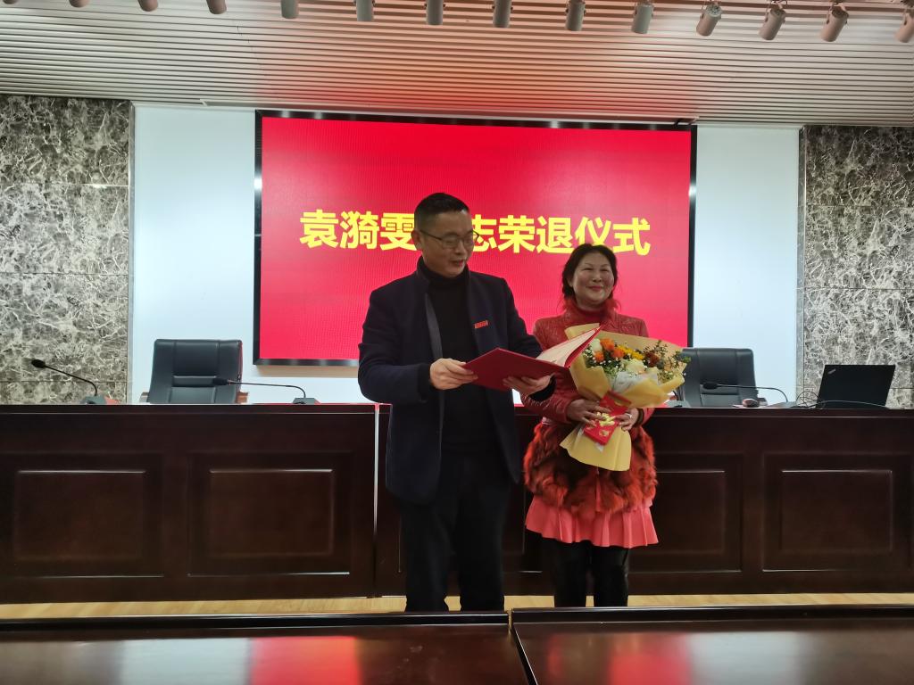 党委书记张国强向袁漪雯老师颁发了荣退证书,并发表了热情的讲话。他充分肯定了袁漪雯老师为学校教育事业做出的贡献,希望袁老师退休后继续发挥余热,为学校和学院继续做贡献,并祝愿她退休生活快乐幸福!