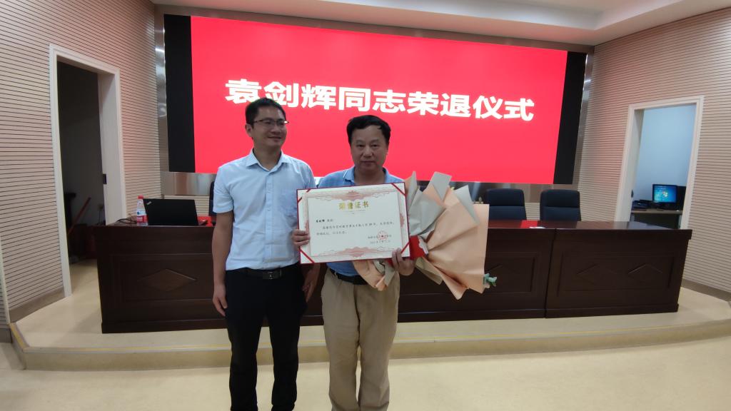 学院党委副书记宋国宁和副院长兼分工会主席刘斯代表学院全体老师向袁剑辉教授献上鲜花和礼品。张卫兵副院长为袁剑辉教授颁发了荣退证书,他对袁教授为学院做出的贡献表示感谢,并送上温暖的祝福。袁剑辉教授非常感动,现场发表感言,他回顾了自己从教30余年的工作经历,有喜悦、有幸福、有感动,也有遗憾。他对在座的年轻人寄予希望,勉励他们努力奋斗,无悔青春;他感谢学校和学院的关心和关爱,祝福学校和学院将来取得更加辉煌的成绩