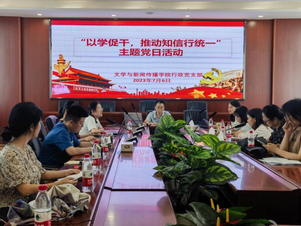 7月6日16:00,文新学院行政党支部在金盆岭校区9教218开展“以学促干,推行知信行统一”主题教育活动。