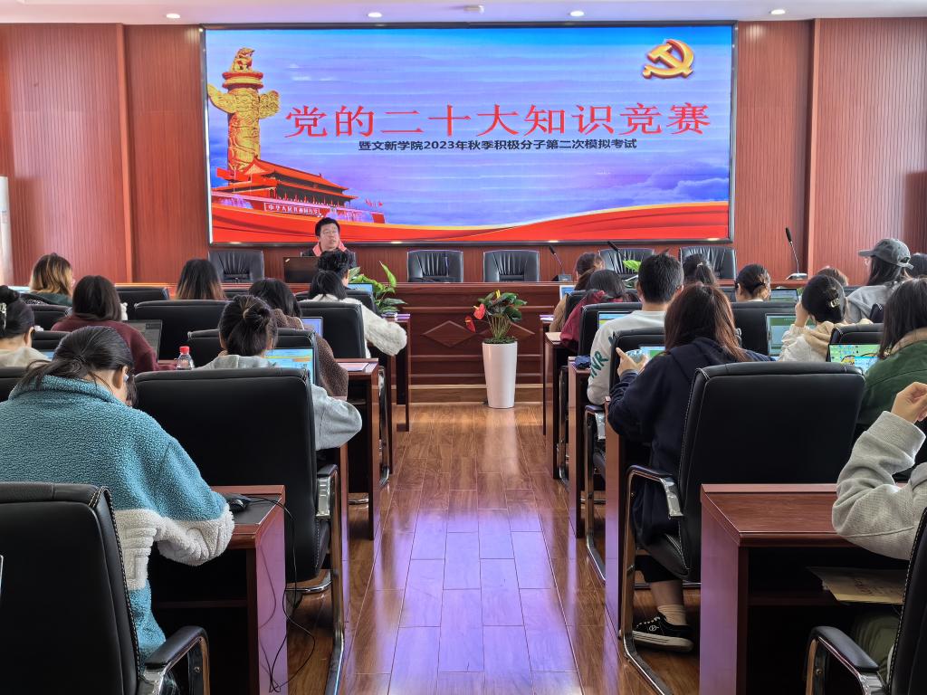 为深入贯彻落实党的二十大精神,积极探索“互联网+党建”的新模式,进一步提升积极分子的理论知识能力水平,11月27日12时30分,“党的二十大知识竞赛暨文新学院2023年秋季积极分子第二次模拟考试”于威廉体育金盆岭校区九号教学楼218室成功举行。