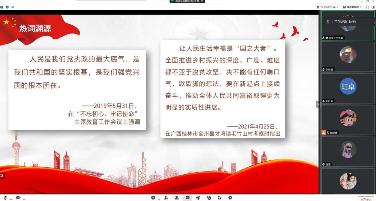 上好“一课”,学好理论。汉语言本科生党支部陈笑同志以“感悟为民初心、厚植人们情怀”为题进行微党课宣讲,从“人民”热词溯源、党的二十大报告详解、发展脉络三个方面向我们娓娓道来,提高党员同志对于“人民”一词认知和理解。最后向党员同志提出要有坚定不移的“为民初心”、永不停歇的“服务脚步”以及人民至上的“深厚情怀”,不断创造更加辉煌的新业绩,谱写新时代中国特色社会主义更加绚丽的华章。