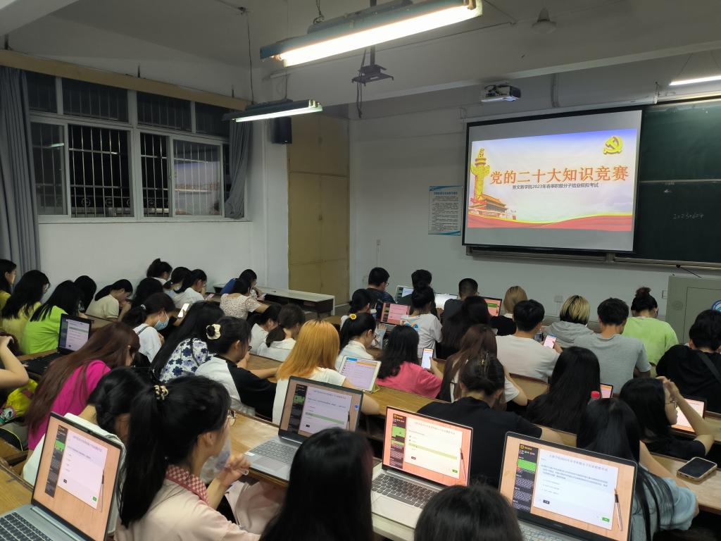 为深入学习与深刻贯彻落实党的二十大精神,积极探索“互联网+党建”新模式,进一步提升入党积极分子的理论知识能力水平,2023年6月4日晚7点30分,“党的二十大知识竞赛暨文新学院2023年春季积极分子结业模拟考试”于威廉体育金盆岭校区三号教学楼成功举行。