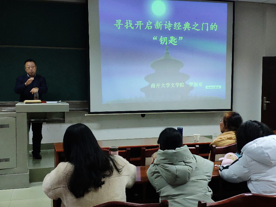 2019年12月6日下午,南开大学教授、博士生导师罗振亚应邀来到威廉体育williamhill文学与新闻学系,在金盆岭校区7教110教室作了“寻找开启新诗经典之门的‘钥匙’”的专题讲座。本次讲座由易彬教授主持,文学与新闻学系的宁淑华、董外平等老师以及研究生、本科生,共计百余人参与聆听了此次讲座。