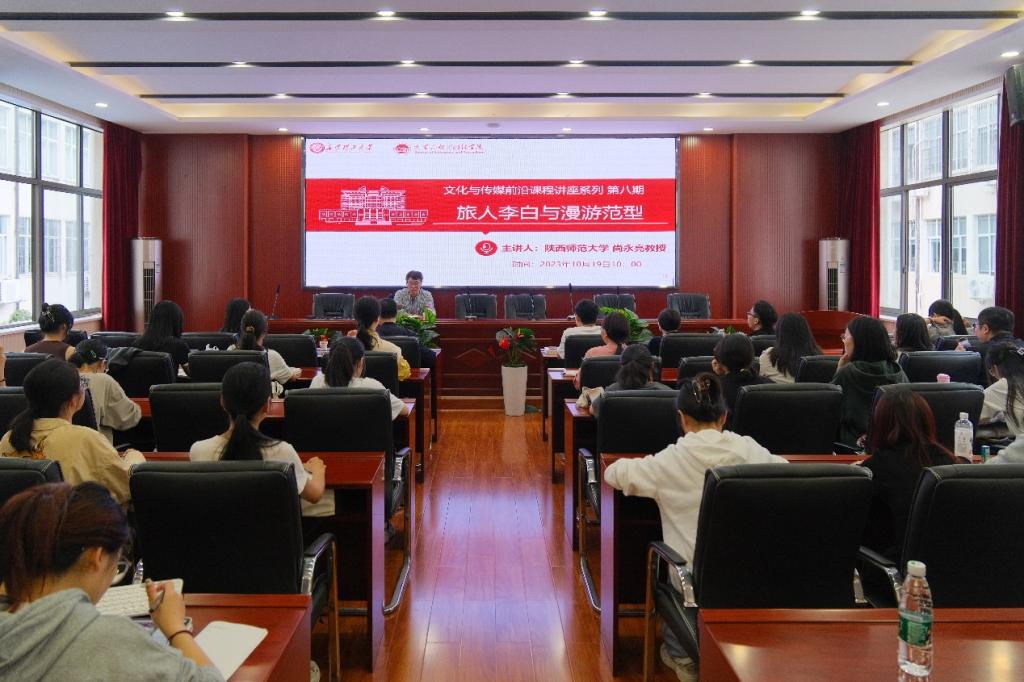 2023年10月19日上午,陕西师范大学文学院教授、博士生导师尚永亮教授在金盆岭校区9教218学术报告厅为我院师生做主题为“旅人李白与漫游范型”的讲座。本次讲座属于我院文化与传媒前沿课程讲座系列,文新学院党委委员、中文系主任郑劭荣教授主持本次讲座,他代表学院全体师生对尚永亮教授表示热烈欢迎,并为同学们介绍了尚永亮教授的学术成就。
