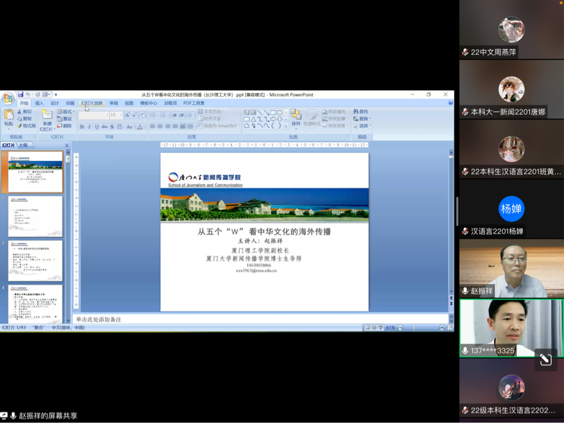 11月10日晚,第十四届研究生云影讲坛文学与新闻传播学院分论坛第二期如期开展。厦门大学教授、厦门理工学院副校长赵振祥为我院师生做了主题为“从五个W看中华的海外传播”的学术讲座。院长刘建新担任主持,文新学院本科生与研究生共三百余人参会。