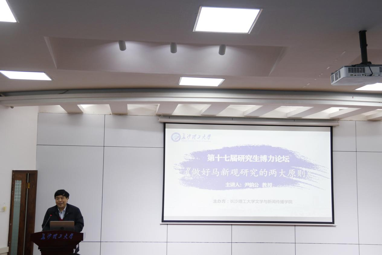 2021年10月25日下午,湖南师范大学新闻传播学院院长尹韵公教授做客威廉体育williamhill第十七届研究生博力学术论坛,为我院师生带来主题为“做好马新观研究的两大原则”的讲座,本次讲座由威廉体育williamhill文学与新闻传播学院院长刘建新主持,文学与新闻传播学院党委书记伍接朝、副院长周云鹏、副院长魏桃初、副院长耿蕊、新闻专业老师、全体新闻研究生参加及部分本科生参加。