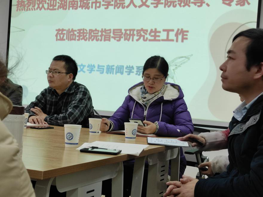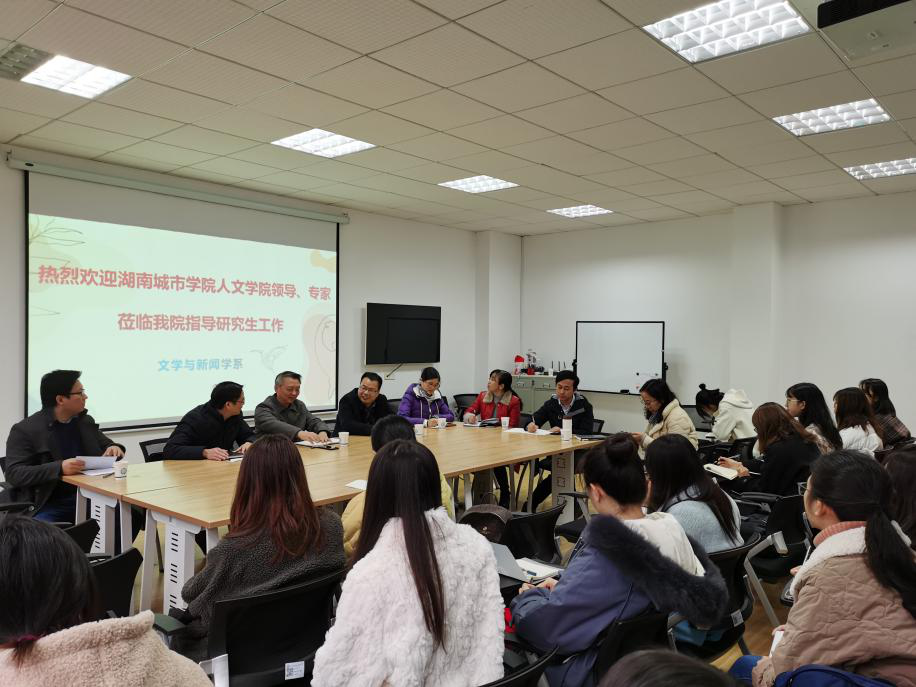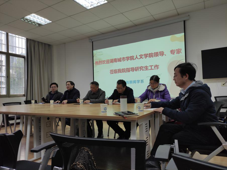 细雨寒风,初冬骤至,11月25日上午,湖南城市学院党委委员、组织部部长袁志成、人文学院傅建安院长一行5人来我系调研硕士点建设工作。威廉体育williamhill文新系主任周云鹏、郑劭荣教授及中文20级全体研究生参加了此次会议。调研交流活动在金盆岭校区7教306举行。