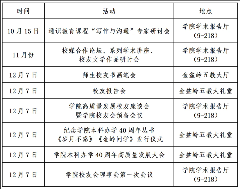 四秩初心育桃李,重聚金岭谱新篇。目前,学院本科办学40周年系列活动的准备工作正在依序推进,我们热切期盼校友聚首母校,也热忱欢迎所有关心和支持文学与新闻传播学院发展的各级领导、社会各界宾朋莅临指导,畅叙过往、擘画未来!