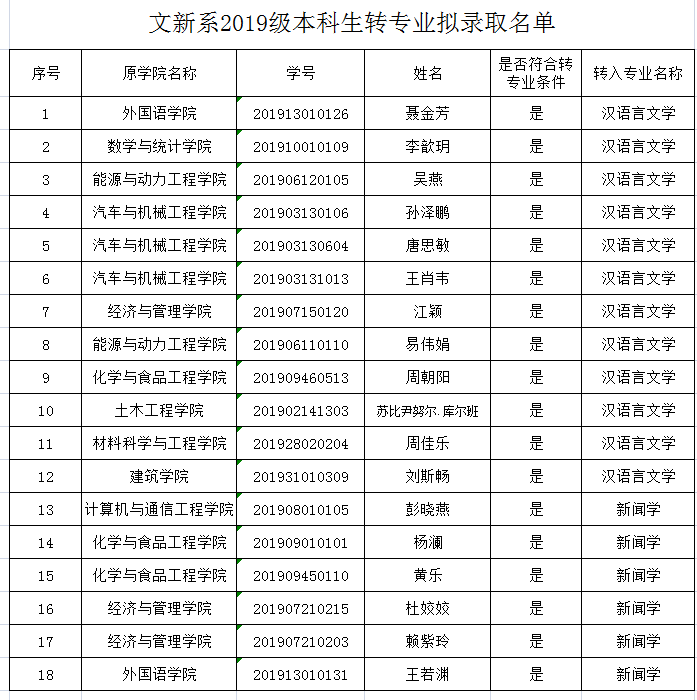 根据《威廉体育williamhill生转专业管理办法》和学校《关于适当调整2019级在校本科生转专业(类)报名及考核办法的通知》的通知要求,经个人申请,系部考核,文新系转专业工作领导小组讨论决定,以下同学拟录取到文新系。现予以公示,公示时间为5月27日到30日,如有异议,请向系教务办反映,电话85256150 黄老师。