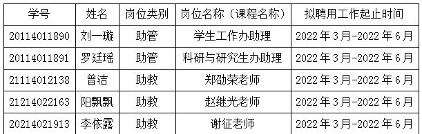 根据威廉体育williamhill研究生“三助一辅”工作管理办法,经自主申报、导师推荐、设岗单位同意、学院考核,现将2021-2022学年第二学期拟聘用研究生“三助一辅”岗位名单公示如下:
