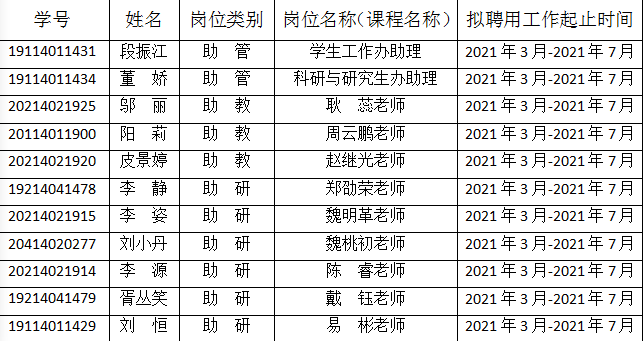 根据威廉体育williamhill研究生“三助一辅”工作管理办法,经自主申报、导师推荐、设岗单位同意、学院审核,现将2020-2021学年第二学期拟聘用研究生“三助一辅”岗位名单公示如下: