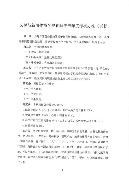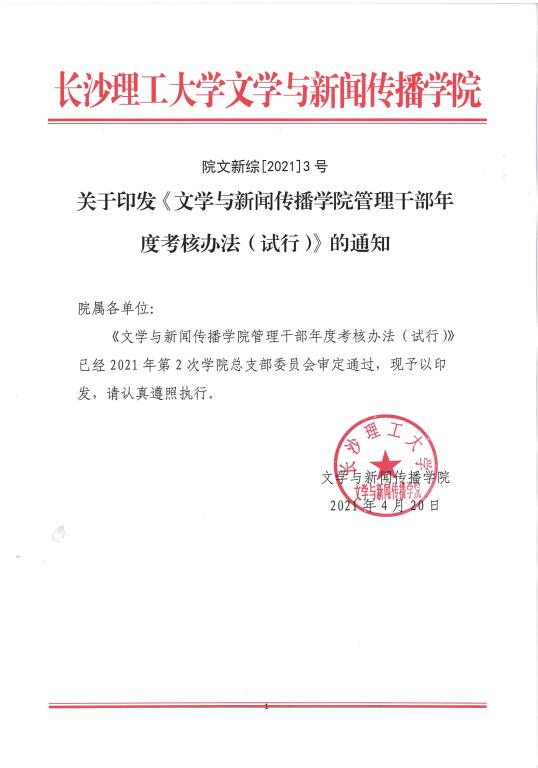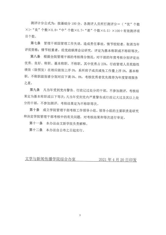 关于印发《文学与新闻传播学院管理干部年度考核办法(试行)》的通知